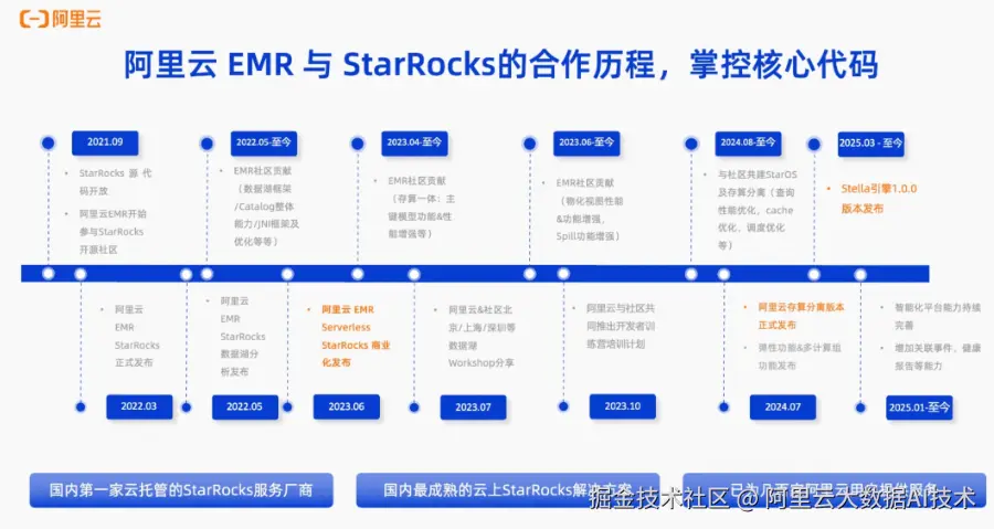 阿里云与StarRocks开源社区的合作可以追溯到2021年,从开源第一天起就建立了深度合作关系。在过去四年中,双方在源码共创、产品发布和技术优化方面积累了丰富的经验。