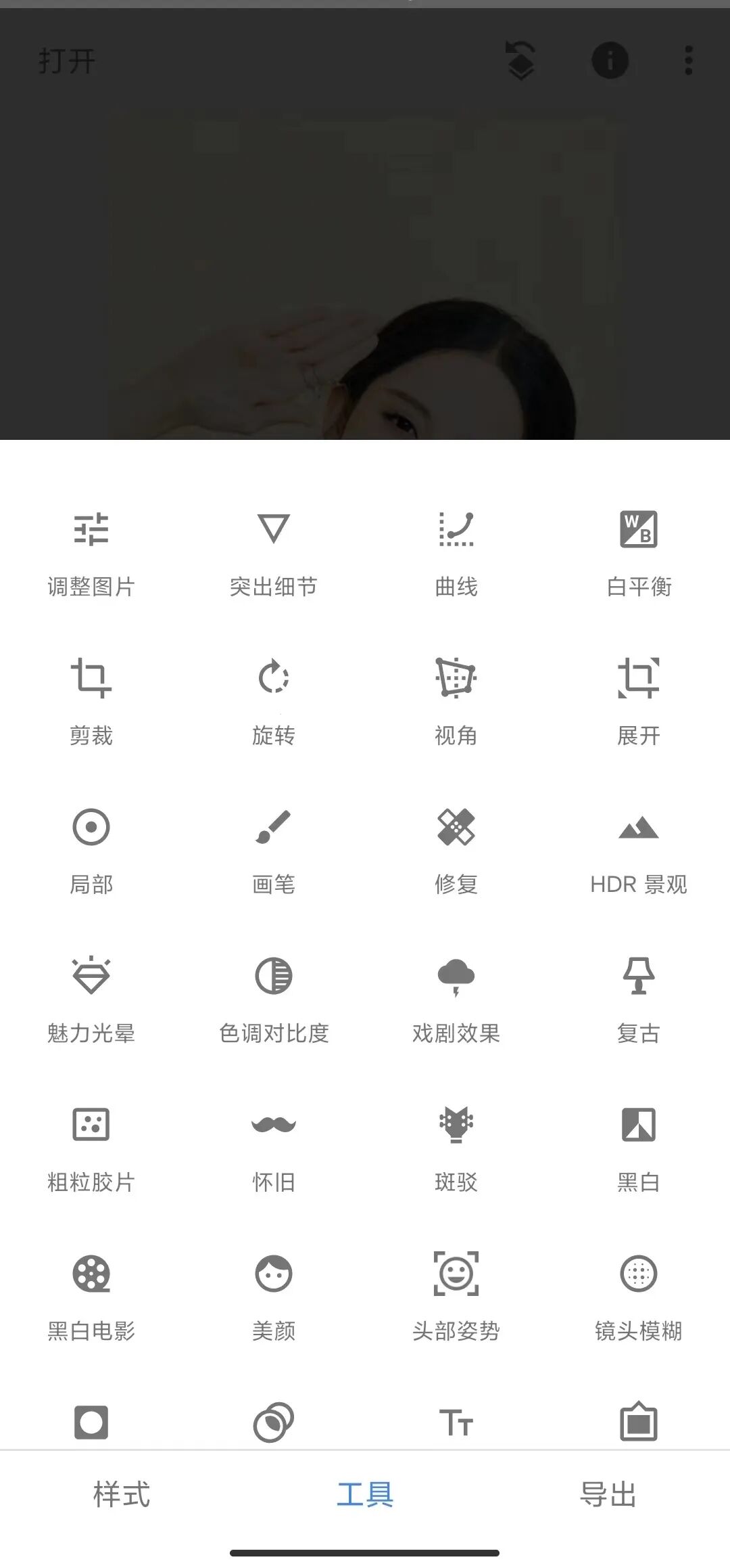 **工具:**Snapseed最强大的地方是在工具里面,里面包括了软件的所有编辑美化图片的小工具,比较常用的有调整图片、突出细节、曲线、白平衡、剪裁、旋转、视角、展开、局部、画笔等等。