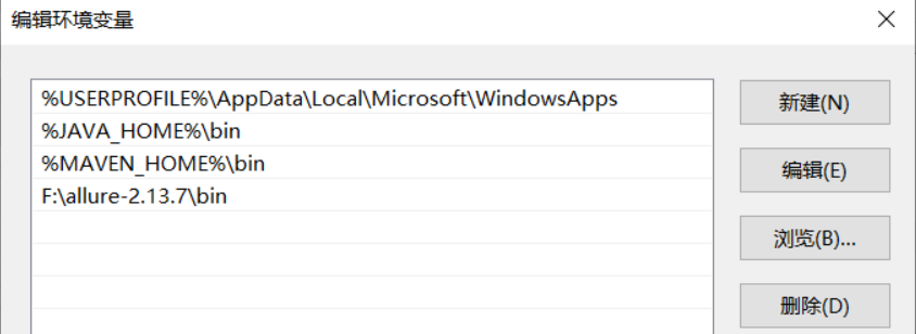 环境变量、Path、添加 F:\allure-2.13.7\bin、保存