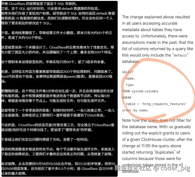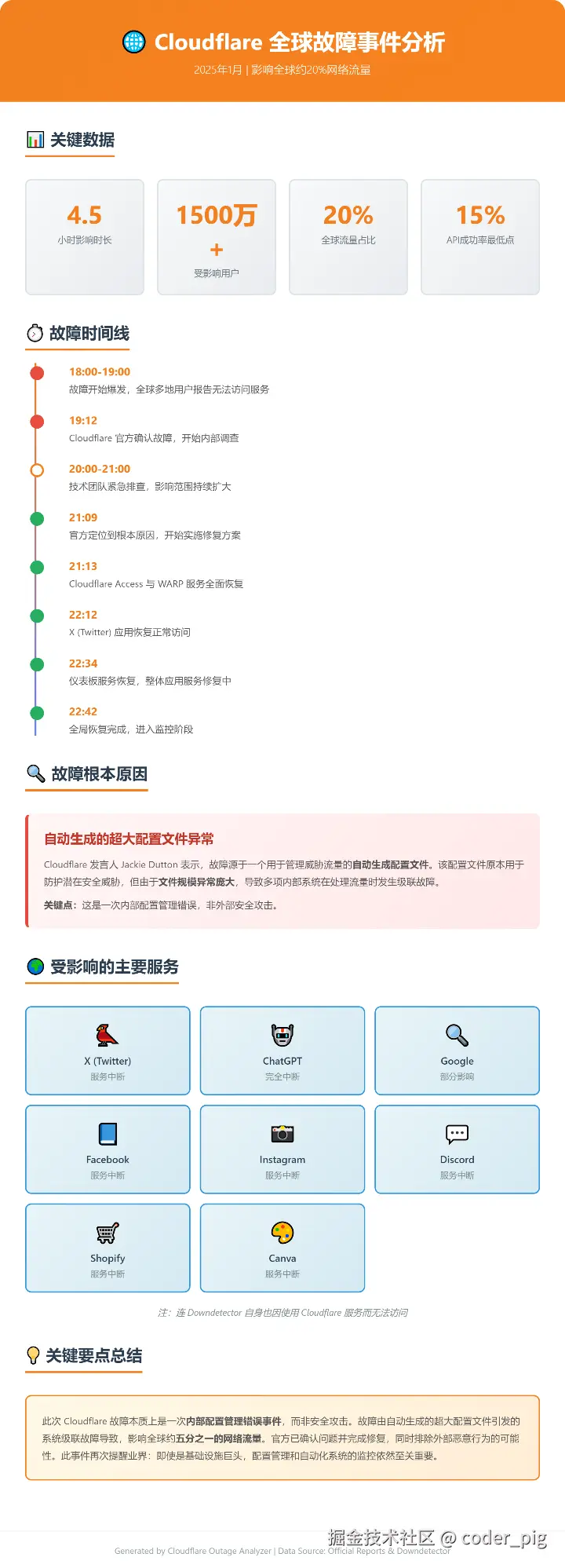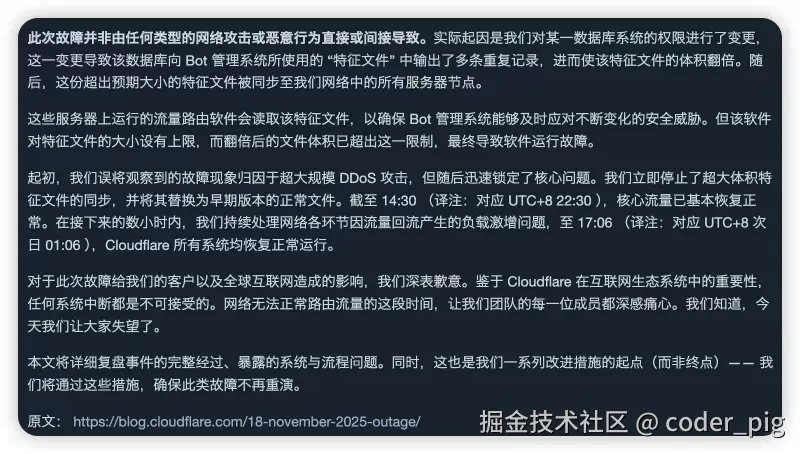 截止目前,Cloudflare 全球网络服务已全面恢复,受影响的X、ChatGPT、Facebook 等主流平台均已恢复正常使用。😀 在网上看到大佬的原因分析,也贴下: