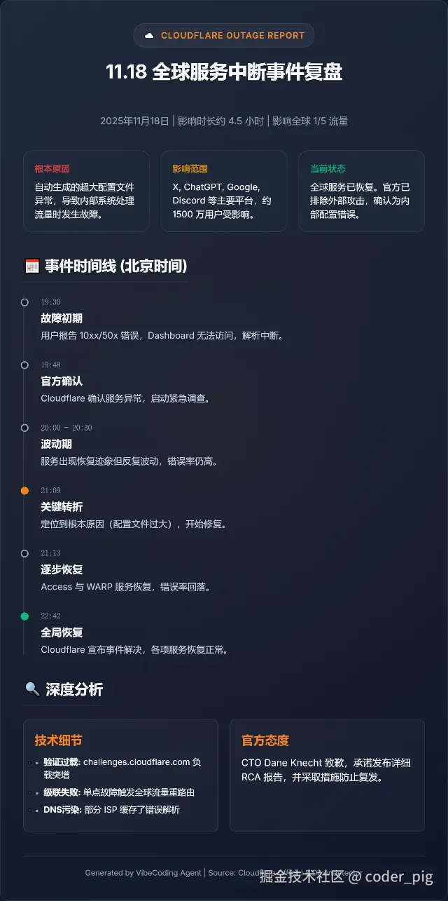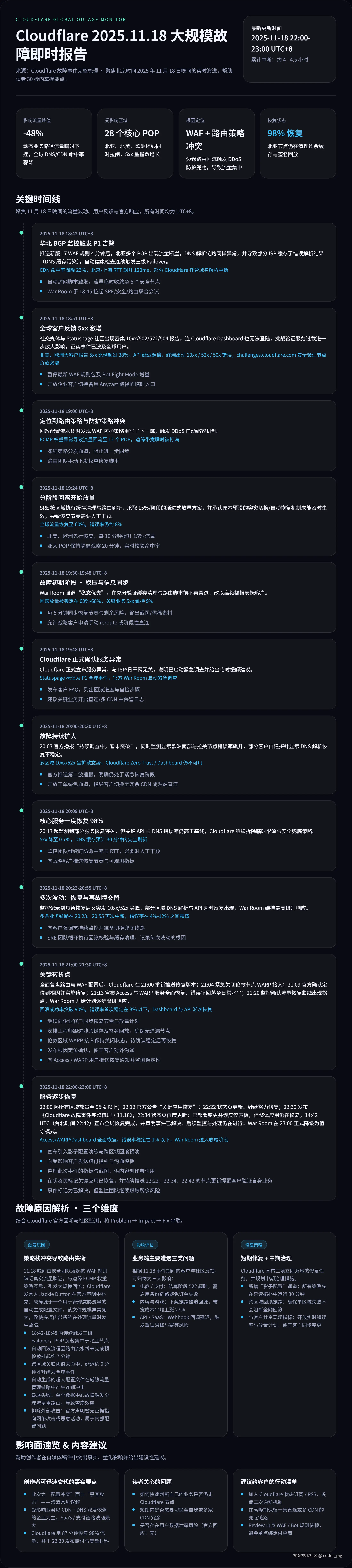 - 【21:13】Cloudflare Access与WARP服务全面恢复,错误率回落至日常水平。