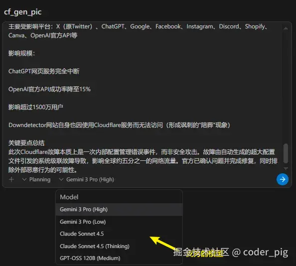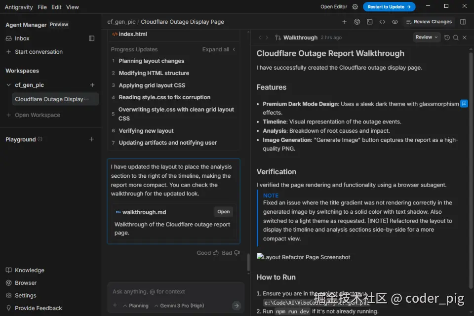 上面我写了一个,让 Antigravity 基于 Claudeflare 故障信息生成一个用于发布到 自媒体平台 的长图的 简单的Prompt ,发送后可以看到 Agent 开始干活:
