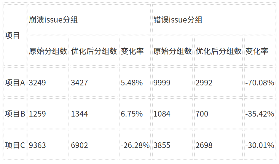 崩溃issue 的原始分组由于游戏引擎和业务逻辑的不同同时存在重复分类和错误分类的情况,所以在优化后,部分项目的分组数相比原来有所增加,部分项目有所降低,上下浮动范围在30%以内,但是经过人工校验核对,分类的精准度都明显提高。