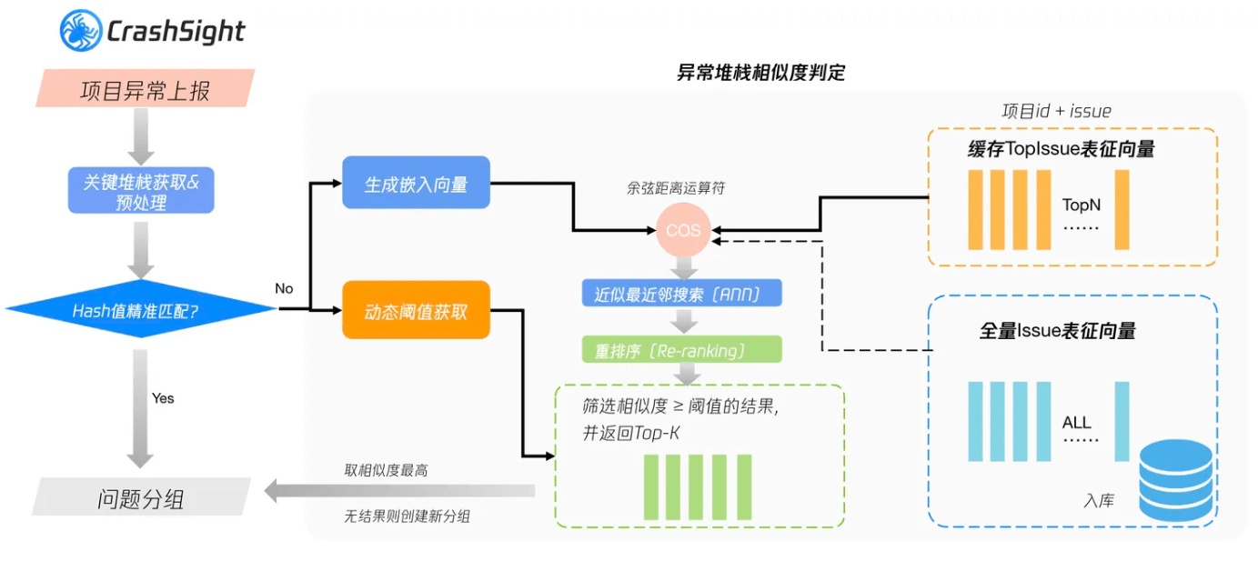 CrashSight提出的基于LLM大模型的堆栈分类优化方案系统架构如下。主流程仍然保留现有的Hash值精准匹配过程,如果精确匹配到已有分组,则不会进入堆栈相似度判定流程。如果检测到新的hash值,则会生成向量嵌入,并将其与数据库中现有的向量值进行相似度判定。判定核心模块主要为:生成文本嵌入向量、动态阈值获取、近似最近邻检索(ANN)、重排序(Re-ranking)、向量区分和存储。