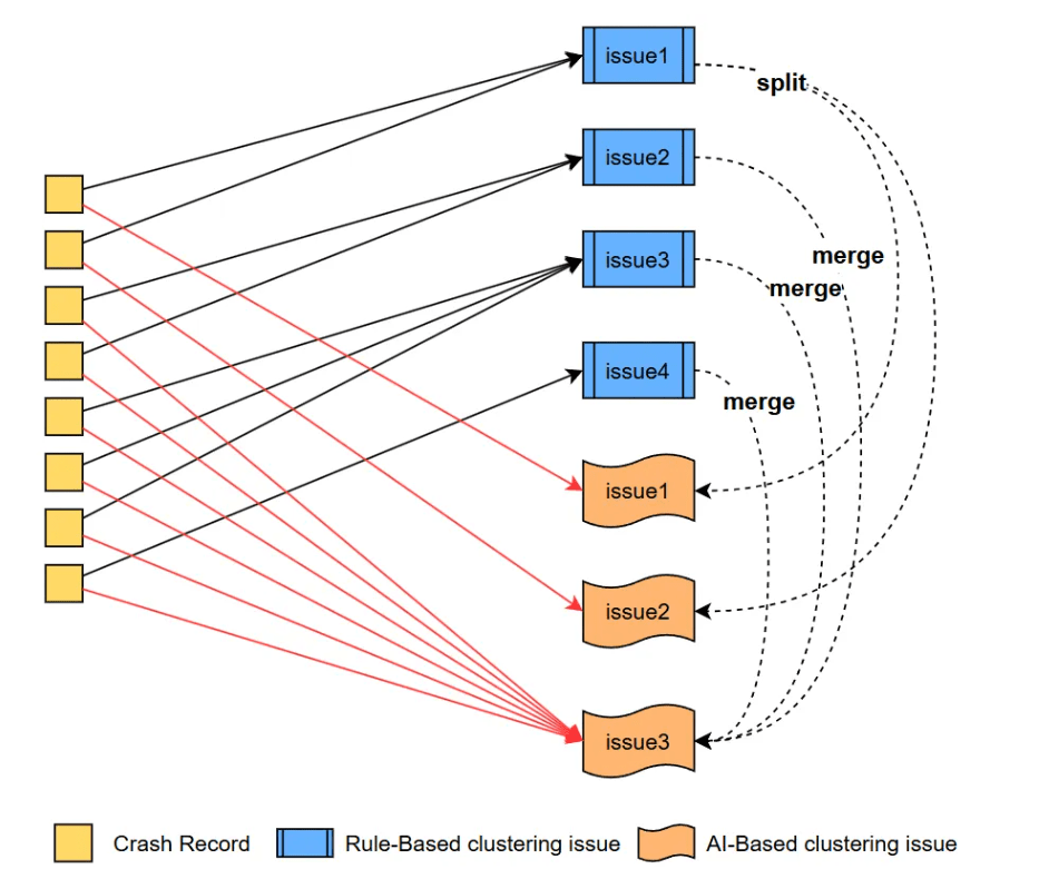 基于规则的问题分类(Rule-Based Clustering)和基于AI的问题分类(AI-Based Clustering)关系如下所示。