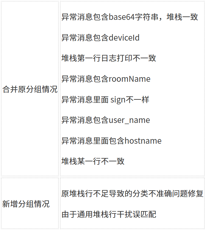 为确保新的分组没有"矫枉过正"从而产生大量分组错误,我们人工排查了新分组包含的堆栈情况,发现新分组相比旧分组主要新增了如下几类情况致: