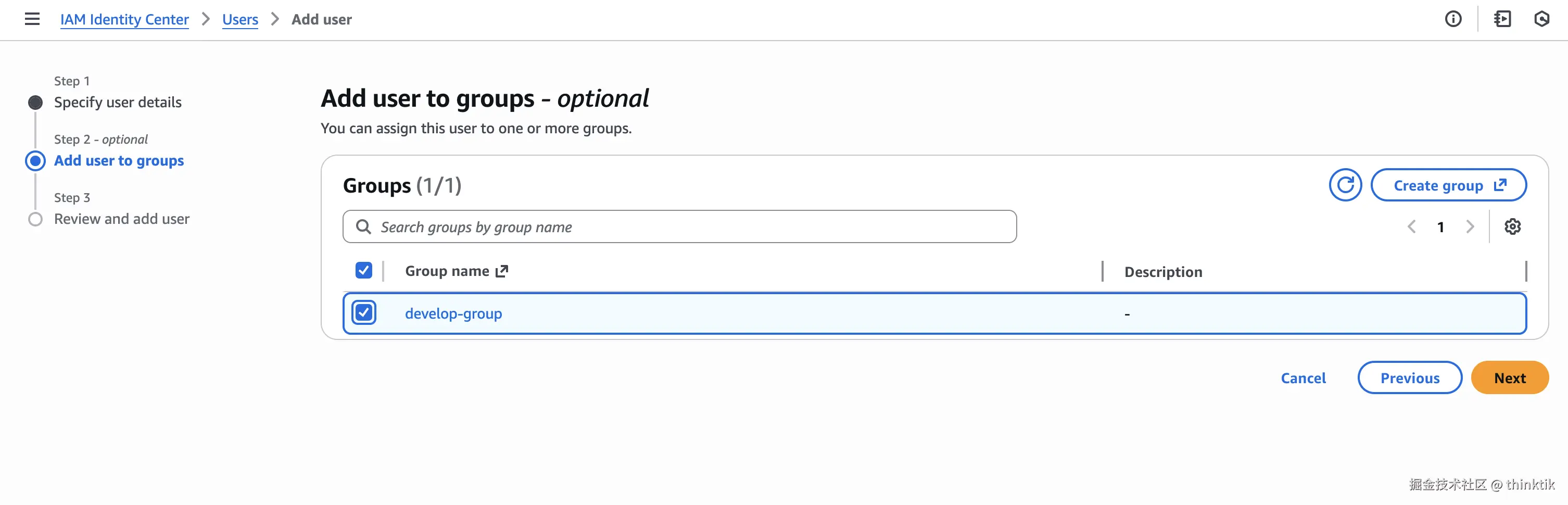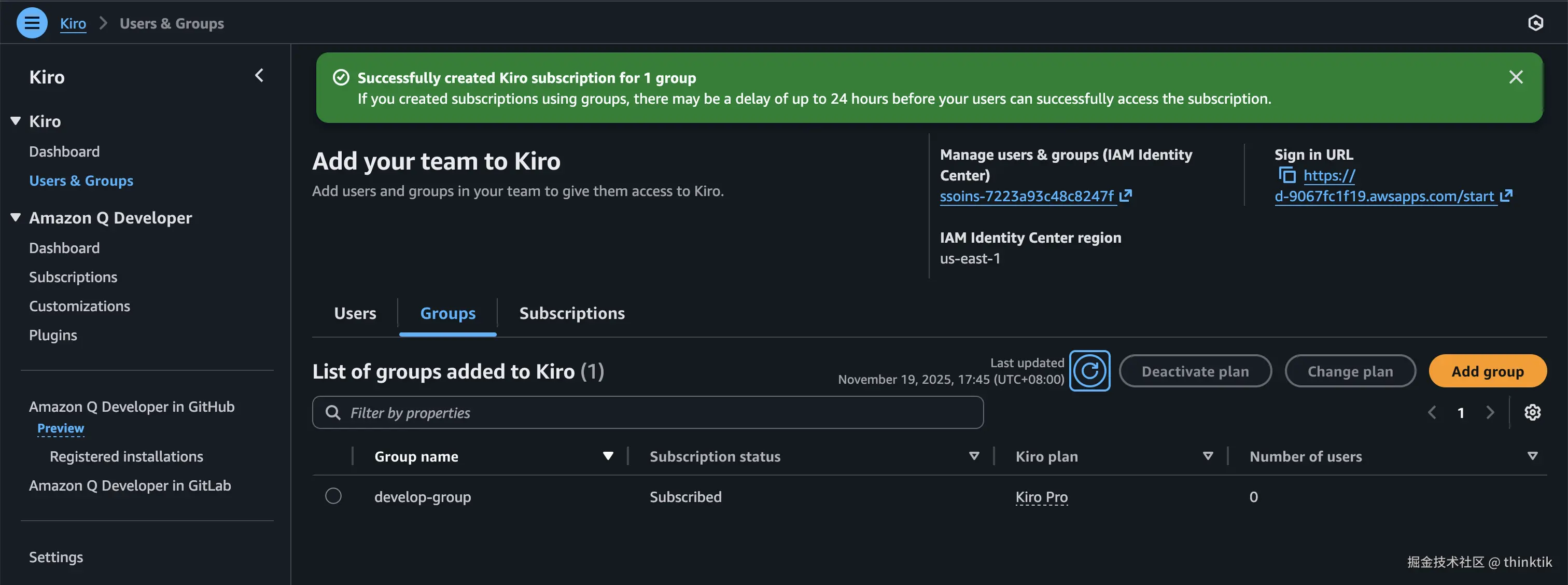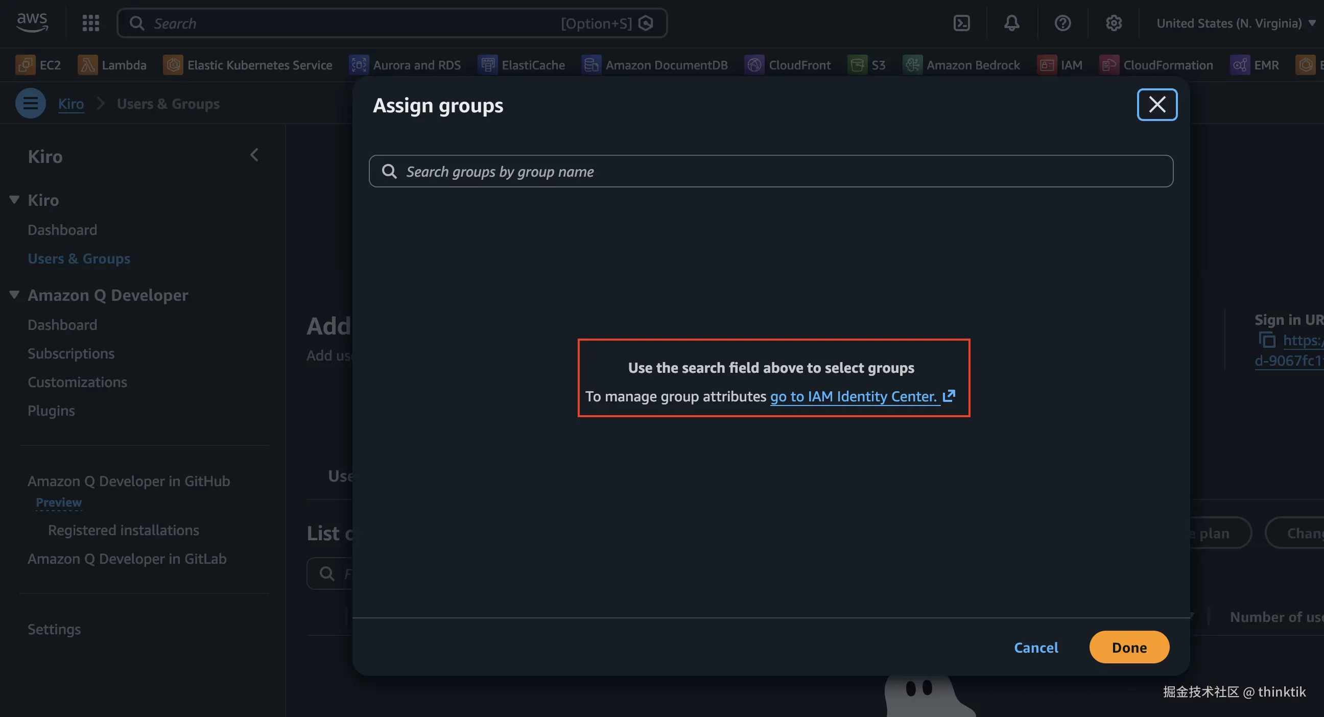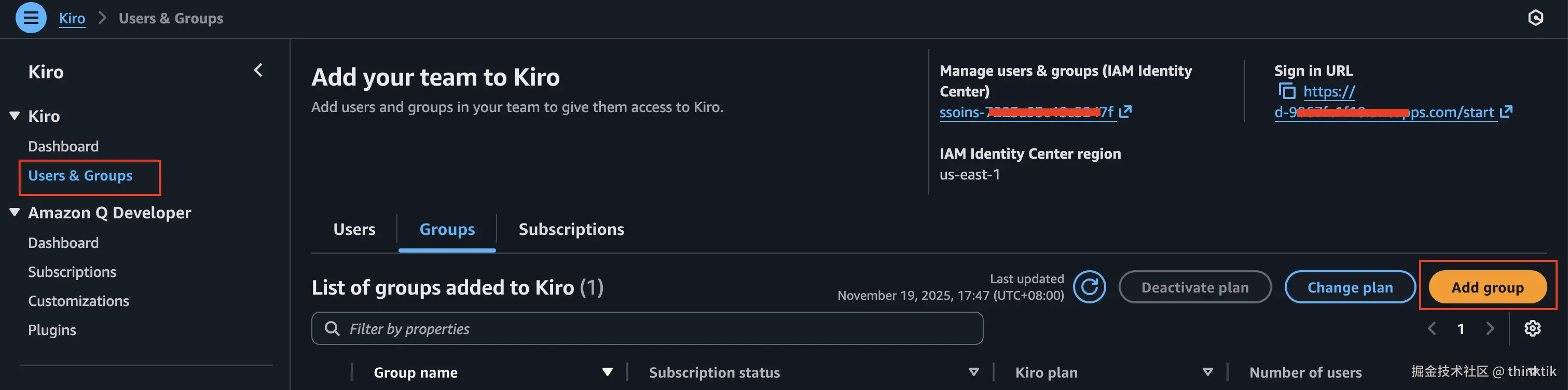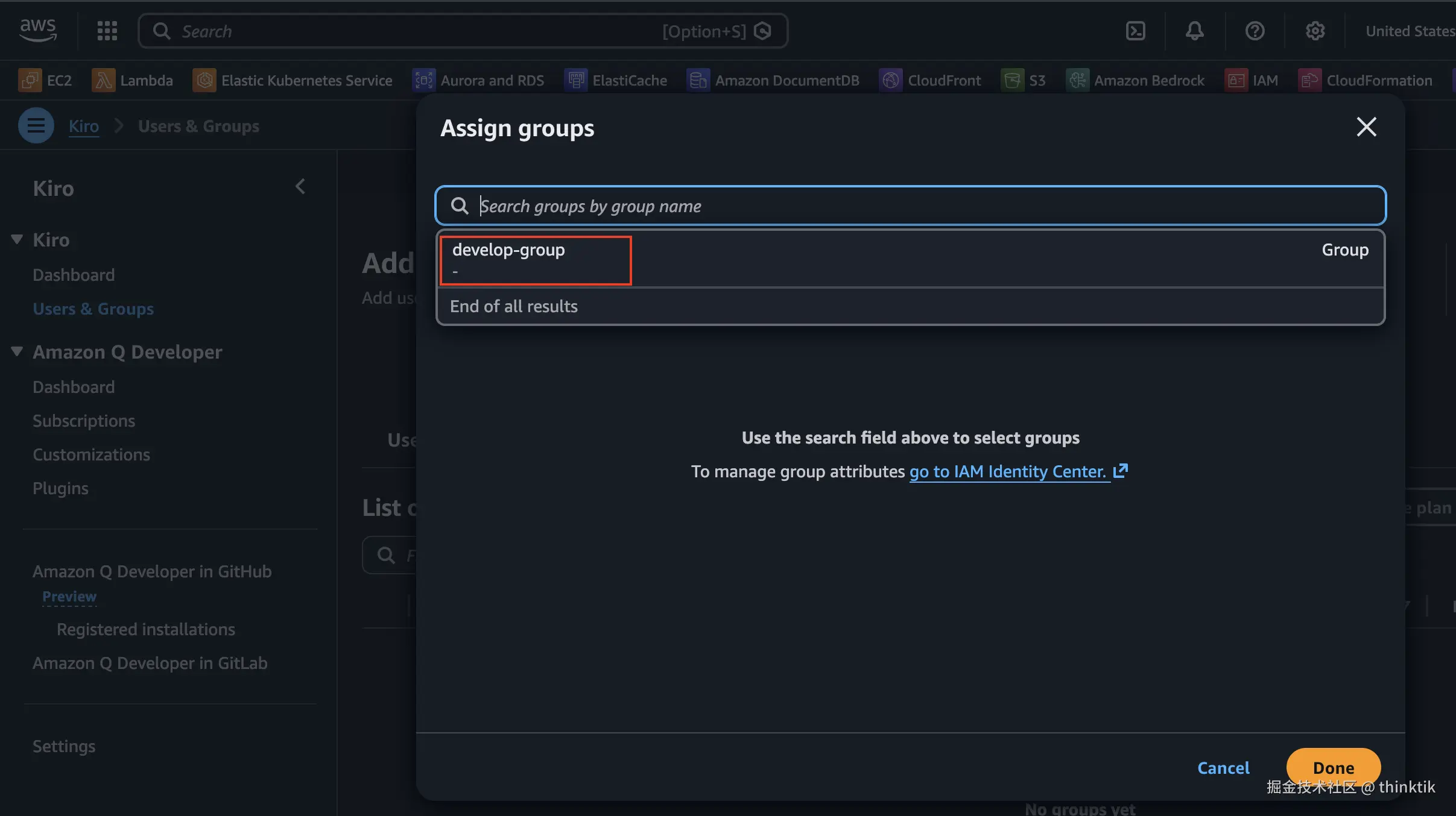 在AWS Kiro控制台我们可以继续添加组,选择我们刚才创建的用户组