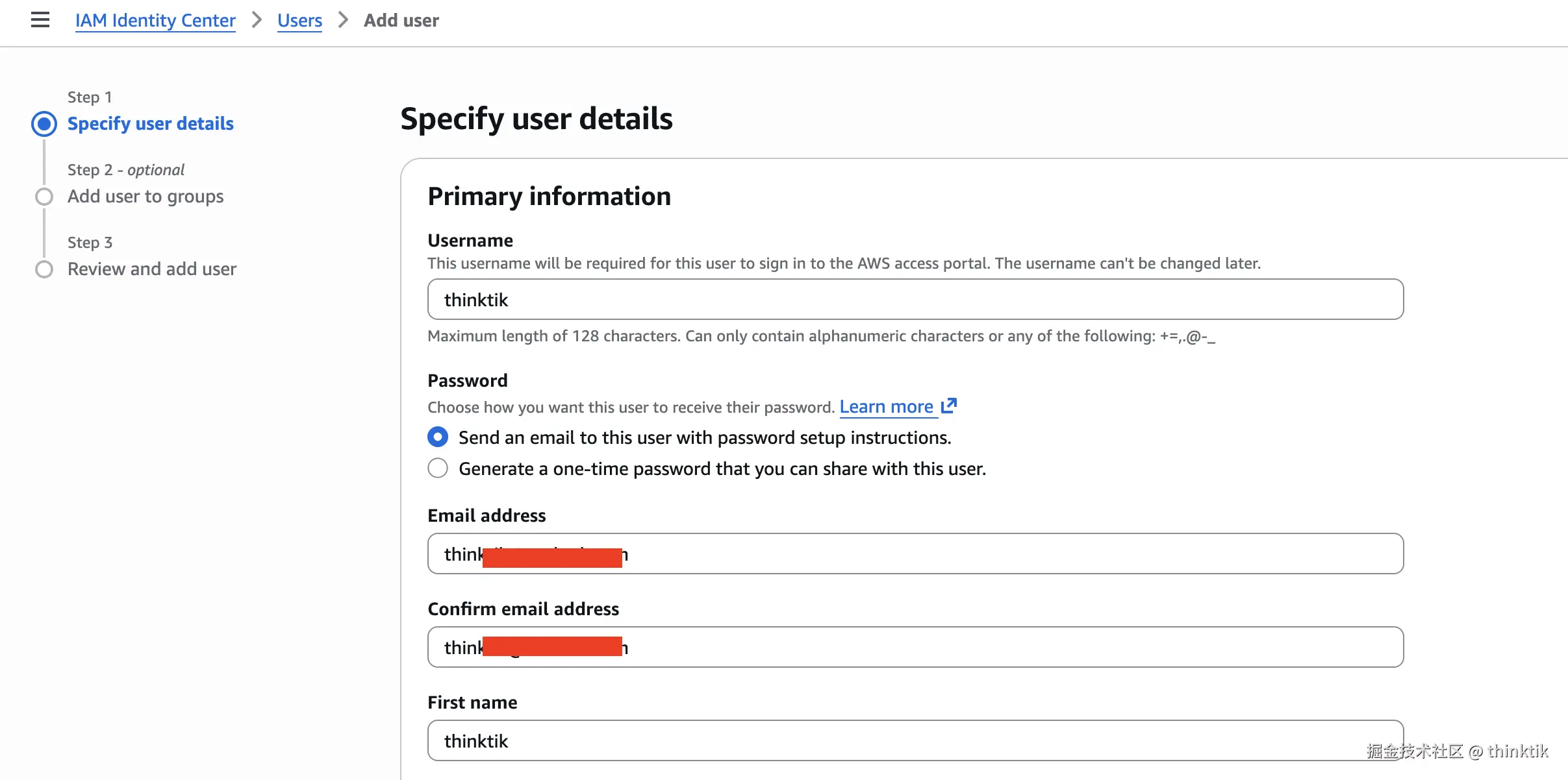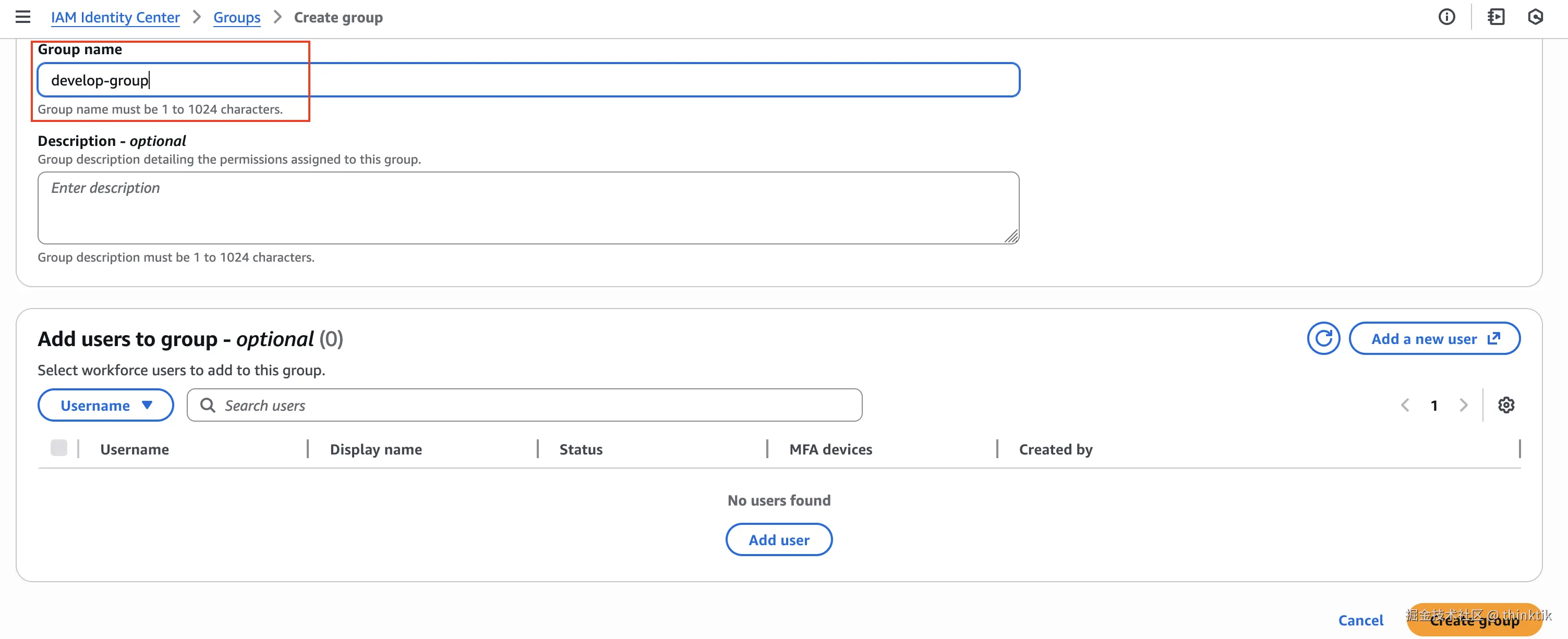 在AWS IAM Identity Center创建组,我们可以直接给一个组名,用户后续可以自己添加