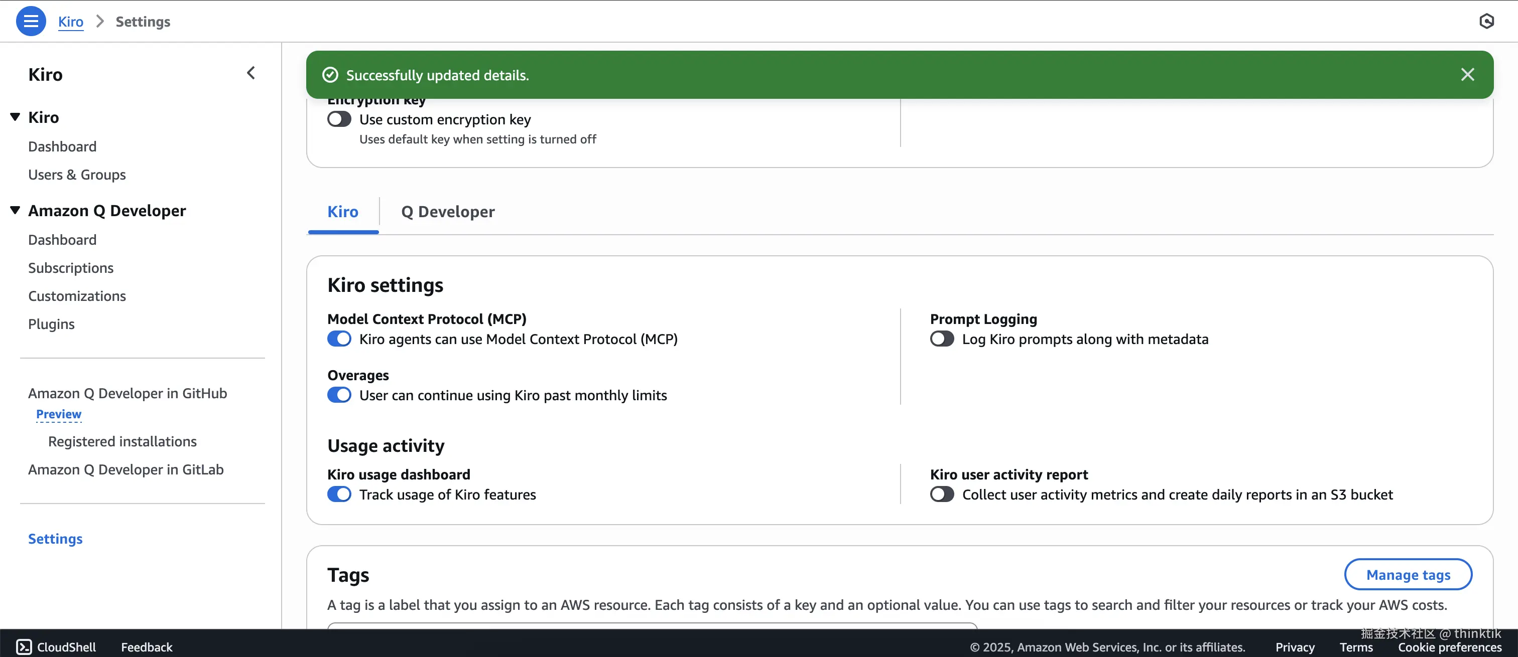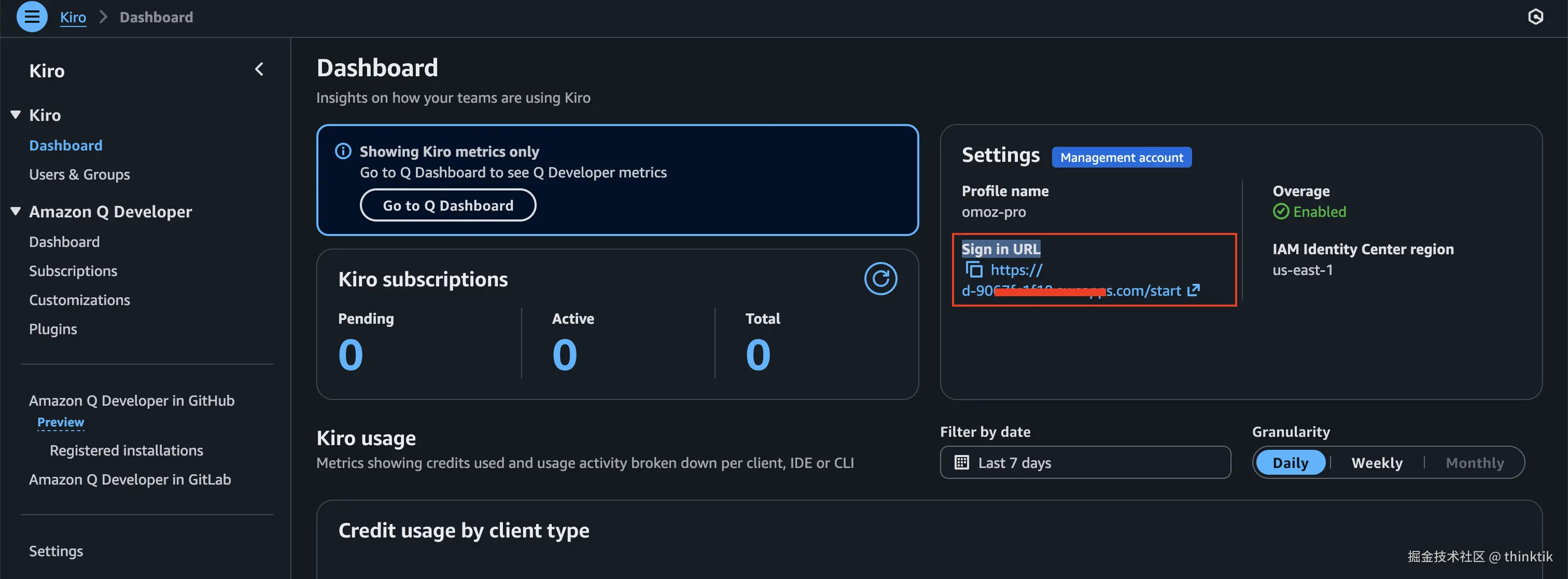 这里需要补充Sign in URL,这个URL在激活邮件里面有,此外我们可以在AWS Kiro控制台上找到