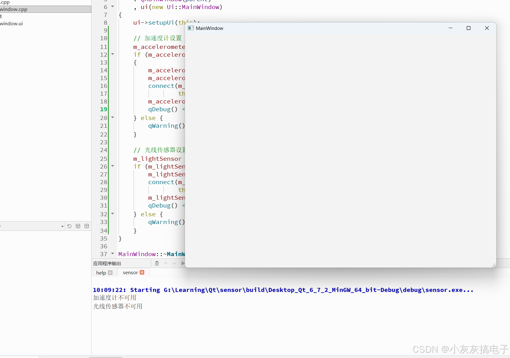 cpp#include "mainwindow.h" #include "ui_mainwindow.h" MainWindow::MainWindow(QWidget *parent) : QMainWindow(parent) , ui(new Ui::MainWindow) { ui->setupUi(this); // 加速度计设置 m_accelerometer = new QAccelerometer(this); if (m_accelerometer->connectToBackend()) { m_accelerometer->setDataRate(50); // 50 Hz m_accelerometer->setAccelerationMode(QAccelerometer::Combined); connect(m_accelerometer, &QAccelerometer::readingChanged, this, &MainWindow::onAccelerationChanged); m_accelerometer->start(); qDebug() << "加速度计启动成功"; } else { qWarning() << "加速度计不可用"; } // 光线传感器设置 m_lightSensor = new QLightSensor(this); if (m_lightSensor->connectToBackend()) { m_lightSensor->setDataRate(10); // 10 Hz connect(m_lightSensor, &QLightSensor::readingChanged, this, &MainWindow::onLightChanged); m_lightSensor->start(); qDebug() << "光线传感器启动成功"; } else { qWarning() << "光线传感器不可用"; } } MainWindow::~MainWindow() { delete ui; } void MainWindow::onAccelerationChanged() { QAccelerometerReading *reading = m_accelerometer->reading(); if (!reading) return; qreal x = reading->x(); qreal y = reading->y(); qreal z = reading->z(); qDebug() << QString("加速度 - X: %1, Y: %2, Z: %3 m/s²") .arg(x, 0, 'f', 2) .arg(y, 0, 'f', 2) .arg(z, 0, 'f', 2); } void MainWindow::onLightChanged() { QLightReading *reading = m_lightSensor->reading(); if (!reading) return; qreal lux = reading->lux(); qDebug() << "光线强度:" << lux << "lux"; } -