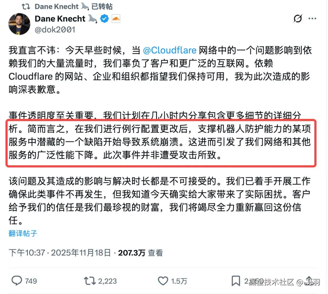 事故的根本原因是因为 Cloudflare 内部的一套用于识别和阻断恶意机器人流量的自动生成配置文件。