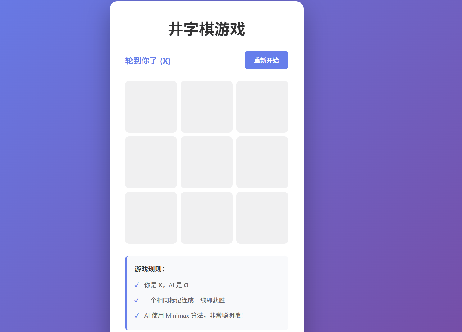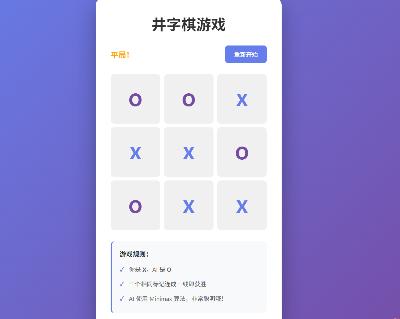 - 智能 AI 对手(Minimax 算法,永不失败)