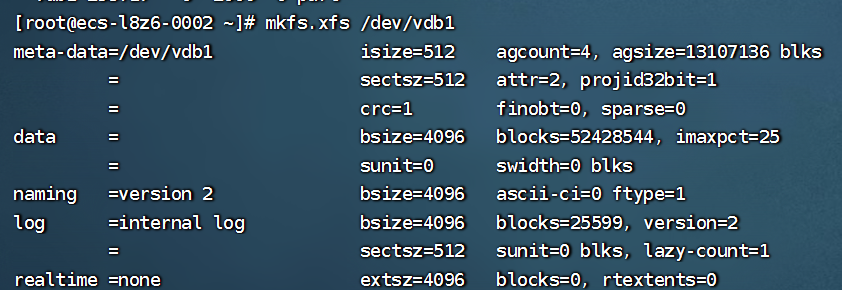 | 3 | 格式化 | mkfs.xfs /dev/vdb1 |