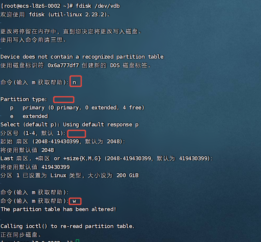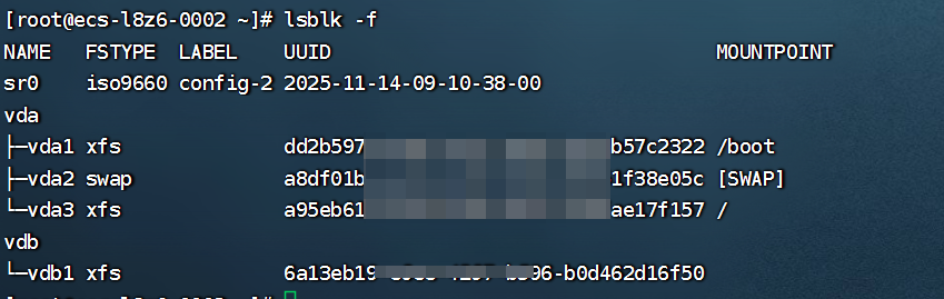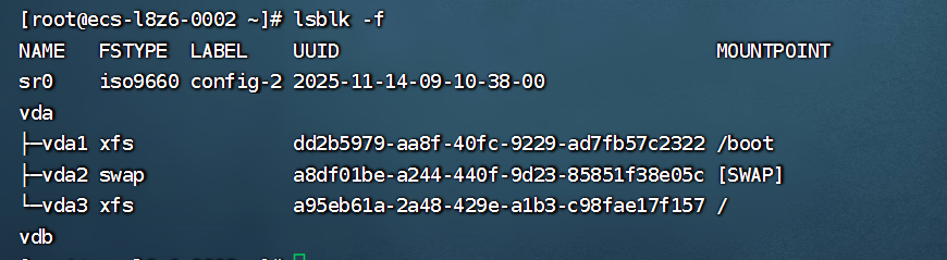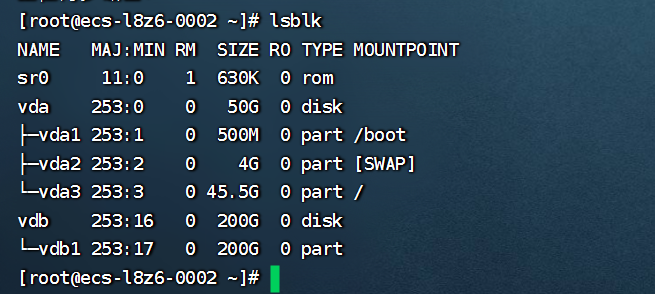 vda是系统盘,已分区并挂载。vdb是 200G 的新数据盘,未分区、未挂载。