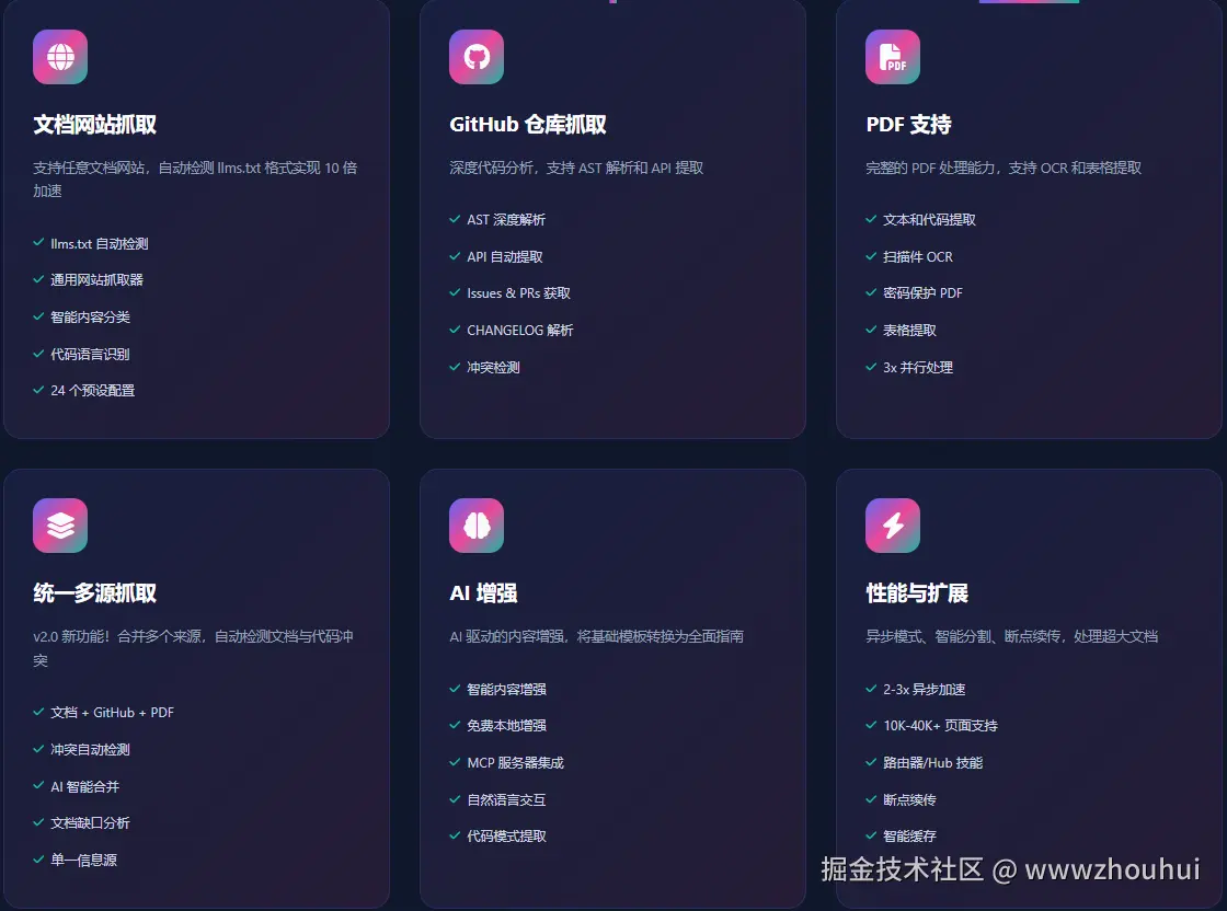 - 🌐 多源抓取: 支持文档网站、GitHub仓库、PDF文件三合一