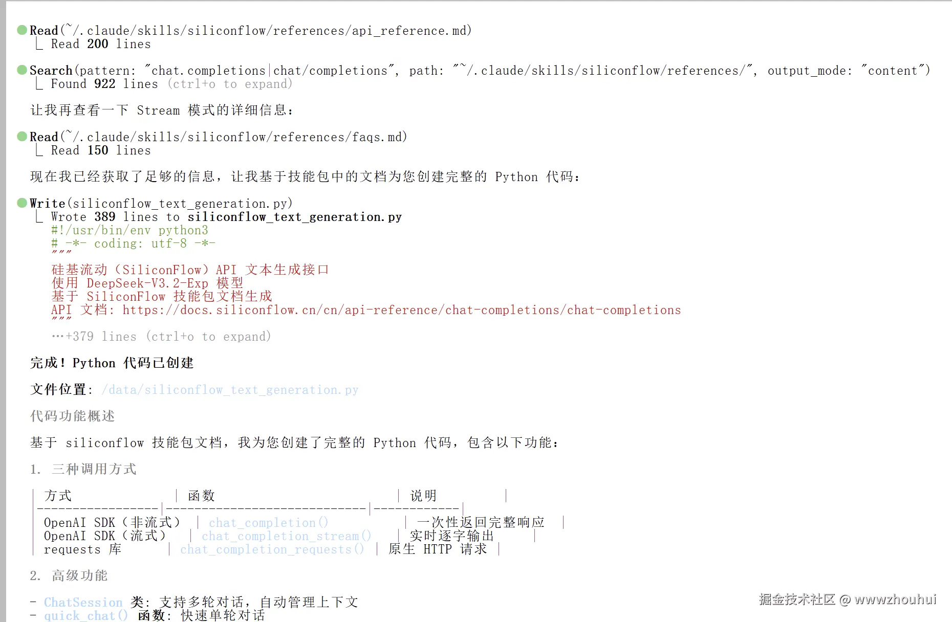 我们的目标: 将这些文档整合成一个技能包,以后在使用硅基流动API时,只需告诉Claude"使用硅基流动的DeepSeek模型生成文本",而无需每次都手动查找API文档、复制请求代码。