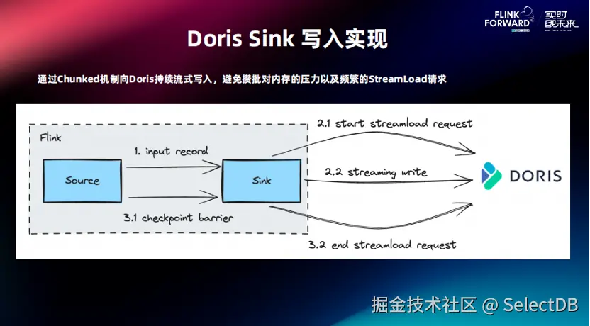 - Sink 端在接收到数据后会开启一个 Stream Load 的长链接请求。在 Checkpoint 期间,它会将接收到的数据以 Chunk 的形式持续发送到 Doris 中。