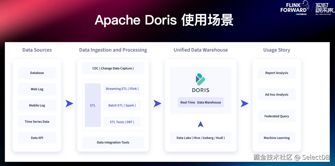 在典型的数据集成和处理链路中,往往会对 TP 数据库、用户行为日志、时序性数据以及本地文件等数据源进行采集,经由数据集成工具或者 ETL 工具处理后写入至实时数仓 Apache Doris 中,并由 Doris 对下游数据应用提供查询和分析,例如典型的 BI 报表分析、OLAP 多维分析、Ad-hoc 即席查询以及日志检索分析等多种数据应用场景。