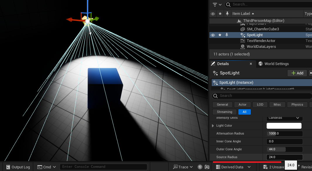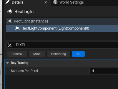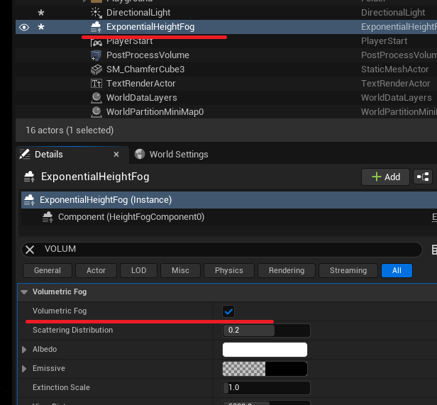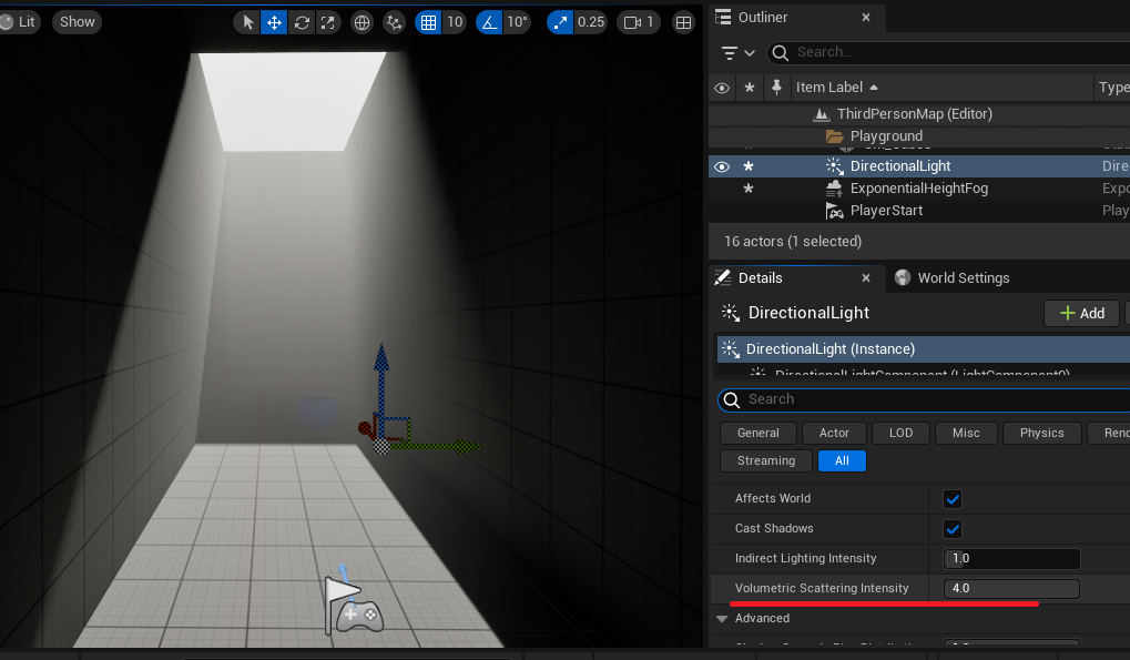 若直接调节体积光照浓度,则整个场景都会受到影响。而在光源内有VolumetricScatteringIntensity参数,可单独影响体积光强度,进行修改即可。