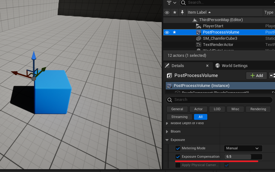 但此时若调节主光源,则整个关卡都会受到影响,不便多人协作。因此可以修改Exposure里的曝光补偿,这样只在PPV影响的区域内受影响。