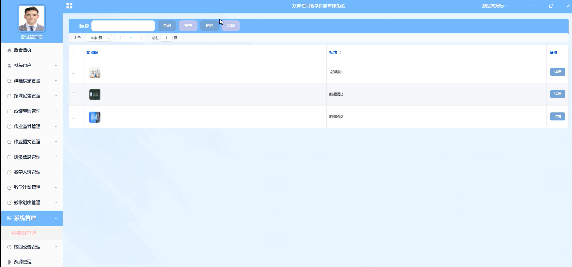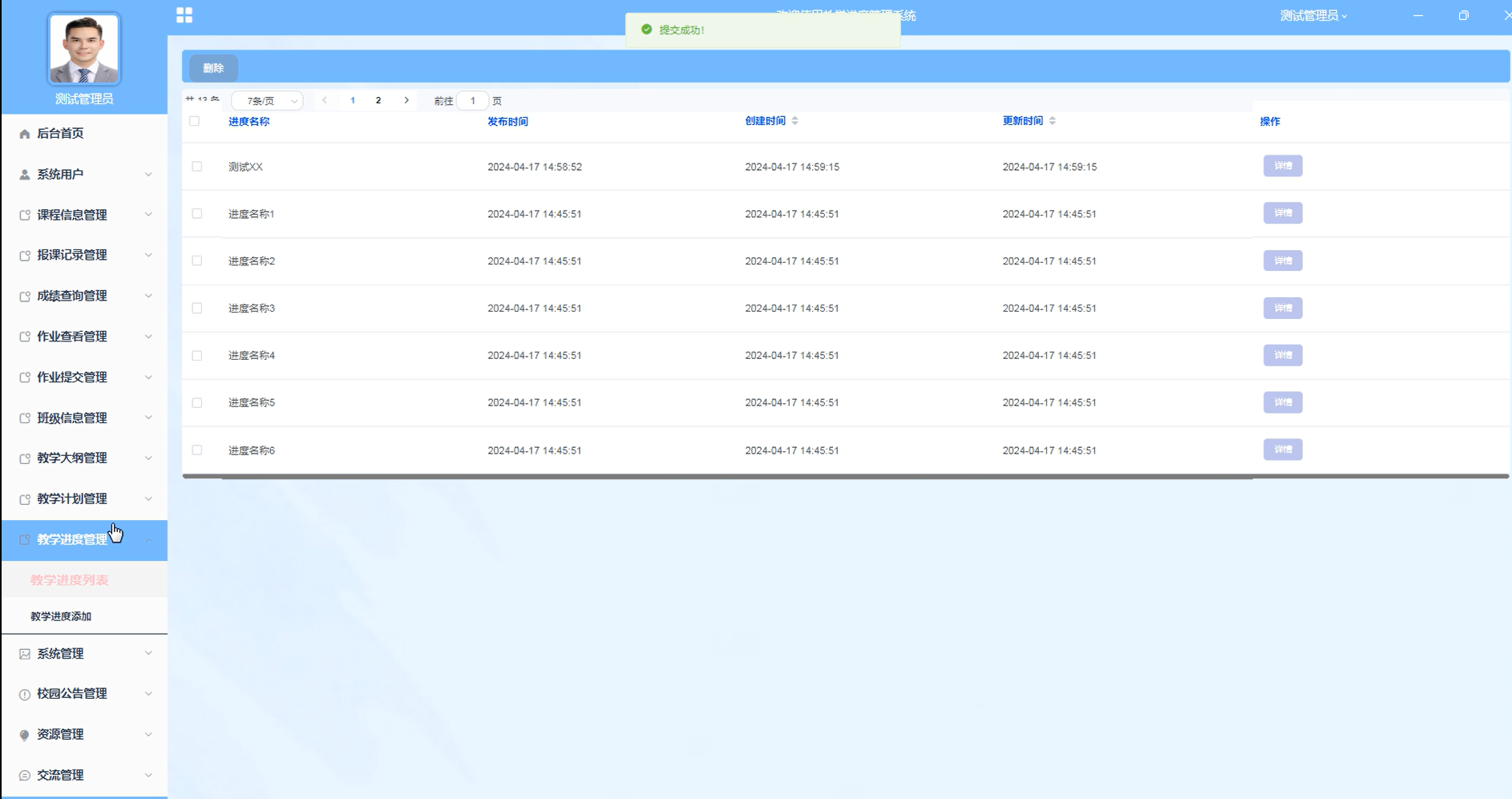 管理员点击"教学进度管理"菜单,可以添加、删除、查看教学进度信息。界面如下图所示。