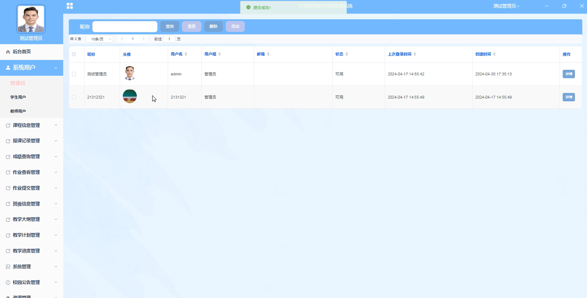springboot教学进度管理系统中的管理人员是可以对注册的学生用户、教师用户进行管理的,也可以对管理员进行管控。界面如下图4-13所示。