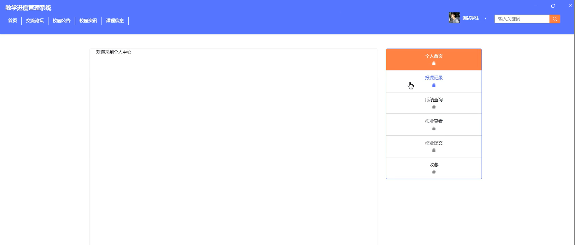 当学生用户点击"个人中心"后,学生可以在个人中心查看自己的报课记录、成绩查询、作业查看、作业提交、收藏等信息,界面如下图所示。