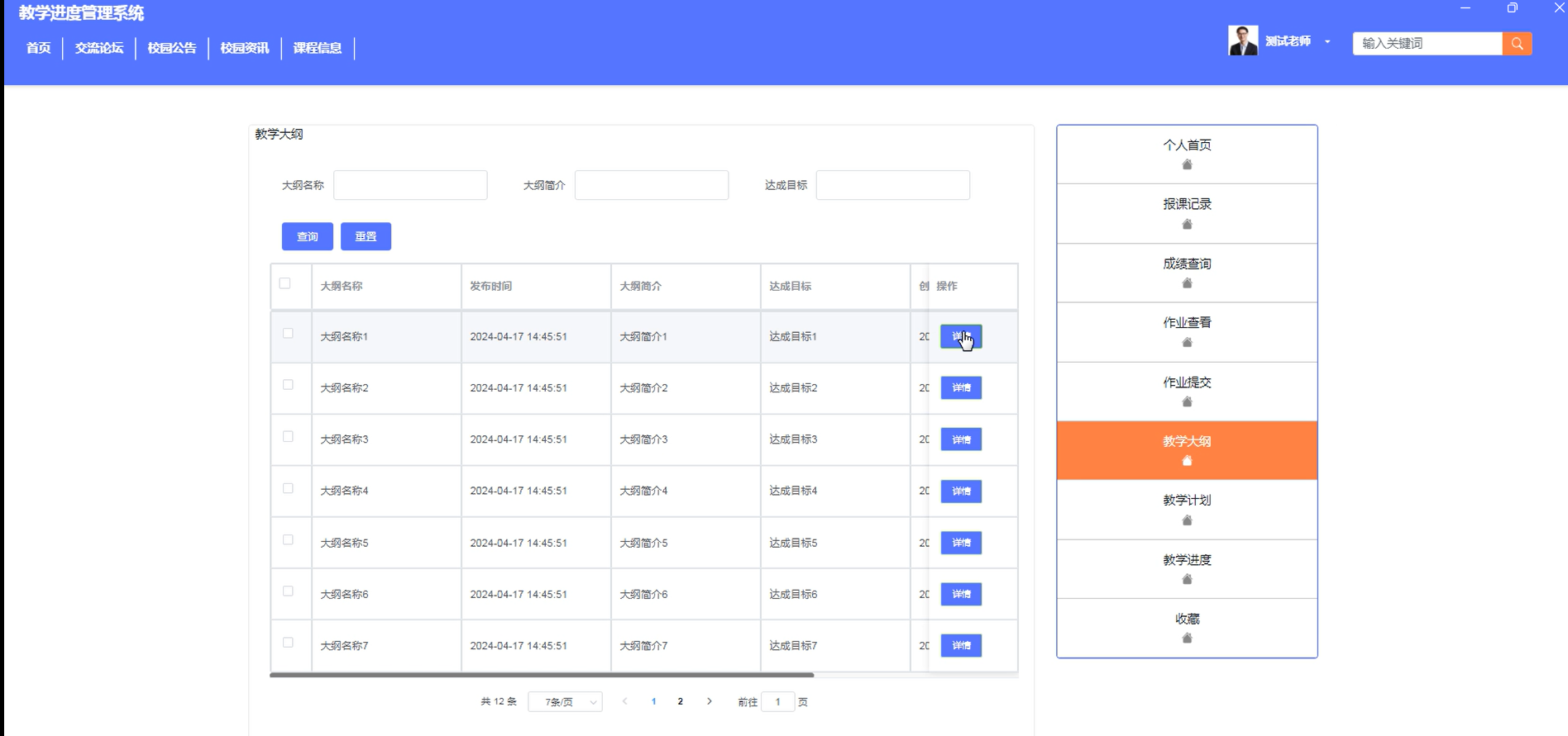 当教师用户点击"教学大纲"按钮后会进入教学大纲列表,教师可以查看系统发布的教学大纲信息操作,界面如下图4-12所示。