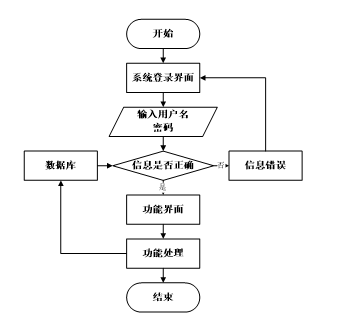 用户打开并进入系统后,会先显示登录界面,输入正确的用户名和密码,系统自动检测信息,若信息无误,则用户会进入系统功能界面,进行操作,否则会提示错误无法登录,操作流程如图2-3所示。