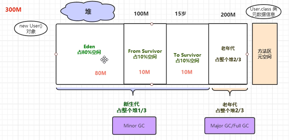 - Eden(800m→Minor GC 后剩 300m)、S0(100m)、S1(100m);