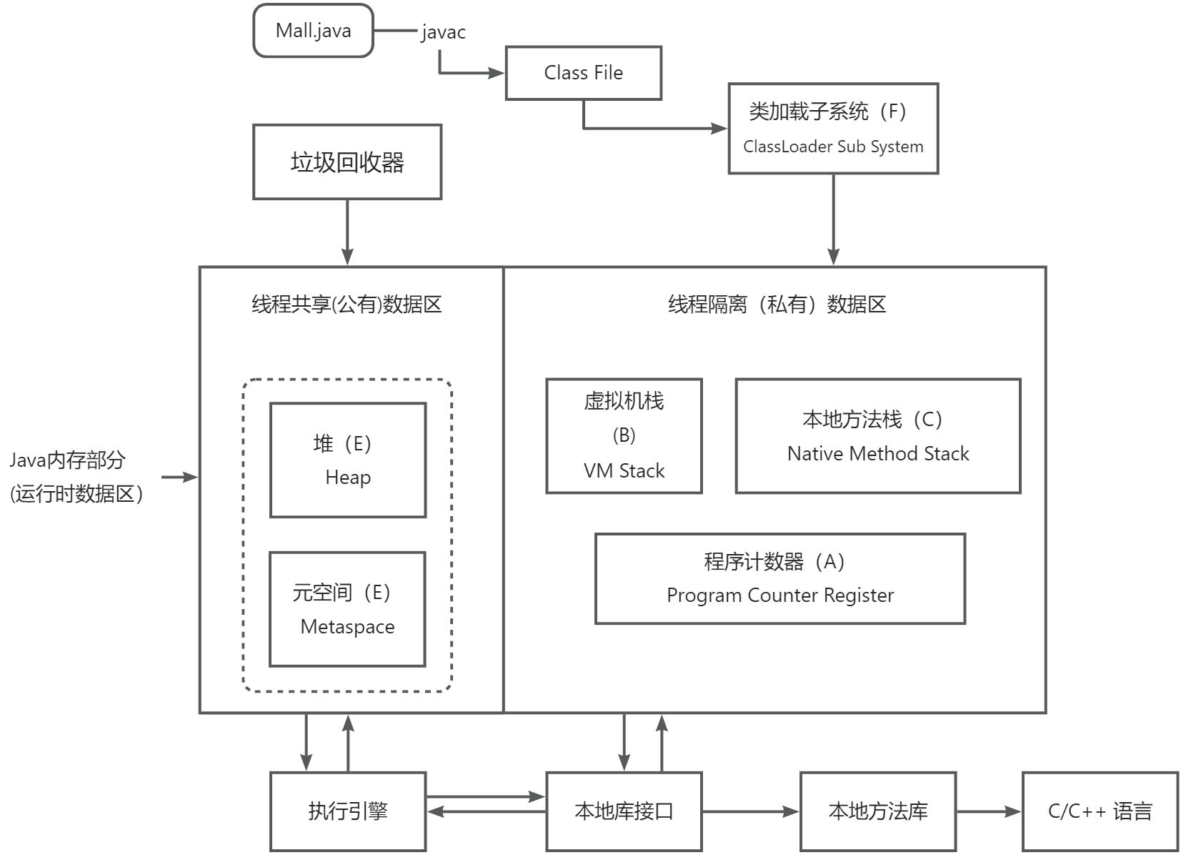 - 类完整生命周期:字节码 → 类加载 → 链接(验证→准备→解析)→ 初始化 → 使用 → 卸载;其中类加载会将类信息存入元空间(方法区)。