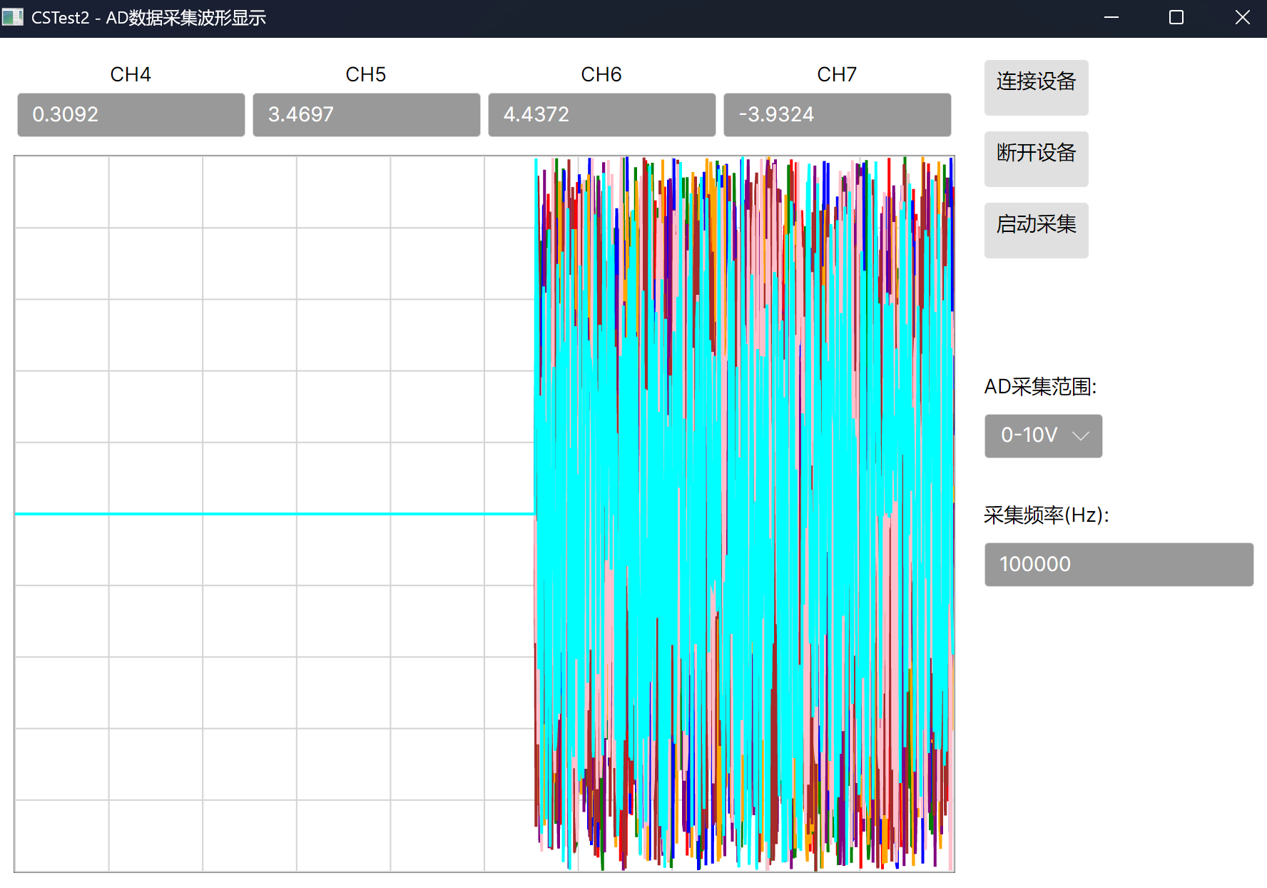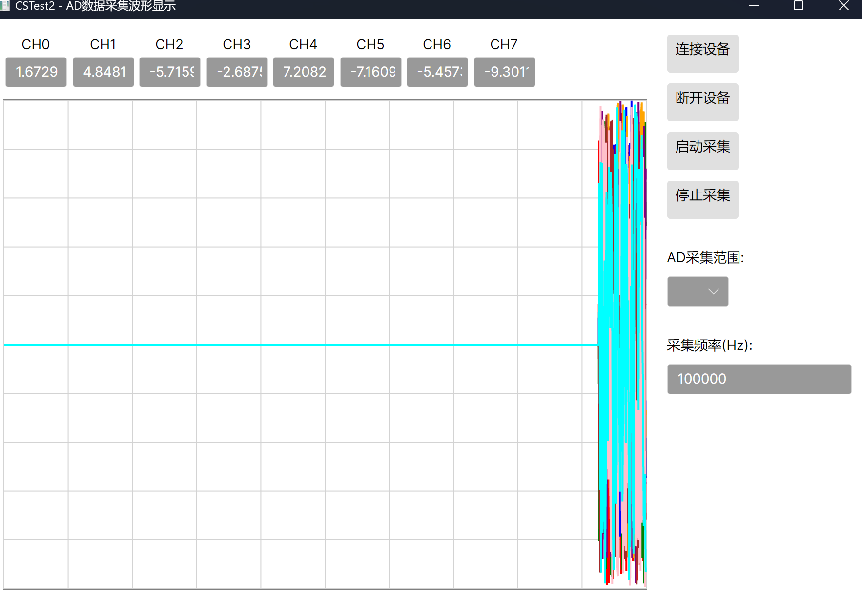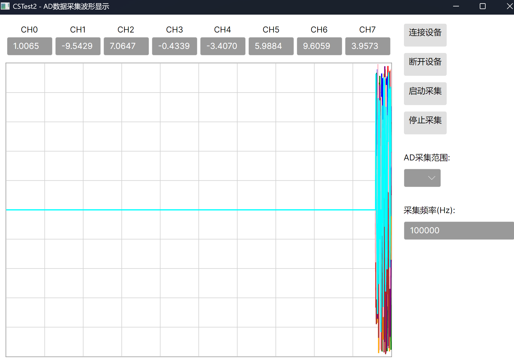 现在您可以打开应用程序窗口,会看到 8 路 AD 数据都在一行显示,每个文本框也更紧凑了。点击"连接设备"和"启动采集"按钮,就能看到波形图的动态效果了! 结果如下图所示: