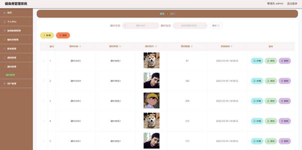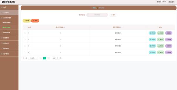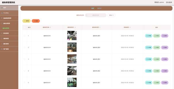 此页面让管理员管理健身房的数据,健身房管理页面见下图。此页面主要实现健身房的增加、修改、删除、查看的功能。