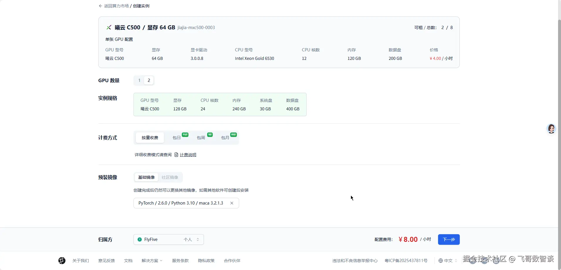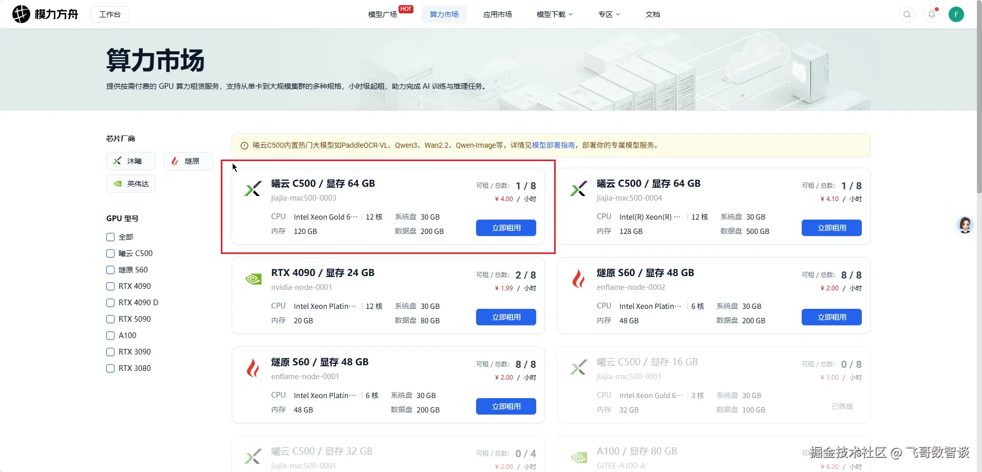 1、访问算力市场:https://moark.com/compute,选择算力,我选择了"曦云 C500/显存 64 GB"。