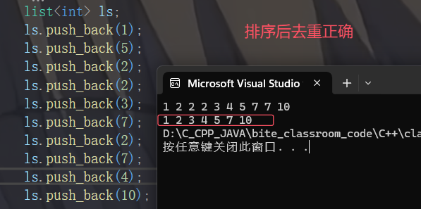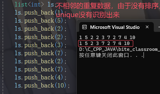 cppvoid test_list3() { list<double> first, second; first.push_back(3.1); first.push_back(2.2); first.push_back(2.9); second.push_back(3.7); second.push_back(7.1); second.push_back(1.4); //任意一个链表无序都将导致merge出错 first.sort(); second.sort(); first.merge(second); for (auto i : first) { //cout << i << ' '; printf("%.1lf ", i); } }unique去重也同样需要链表有序,不然会出现删除不完全的情况(这是因为该函数底层默认认为链表为有序,若相同的数据没有挨在一起,就会识别成不重复)