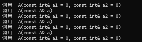 cout << "调用:A(const int& a1 = 0, const int& a2 = 0)" << endl;