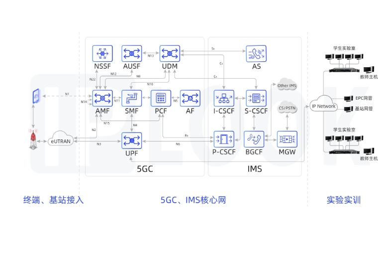 其次是核心设备体系的搭建。5G核心网是实验室的技术中心,需要涵盖AMF、SMF、UPF、UDM、PCF等关键网元,并可搭配IMS实现VoNR语音实验。同时必须与5G基站、终端设备、传输系统等协同运行,形成可独立部署、可演示教学、可开展科研的完整5G网络。IPLOOK提供的云原生核心网完全符合3GPP标准,既能支持基础教学,又能支撑协议研究与工程实验,为高校提供了高度开放的实验环境。