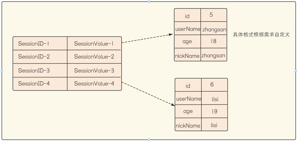 Session中存储的是与用户状态相关的键值对数据,格式由开发者自定义: