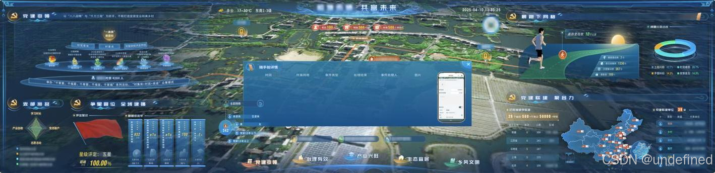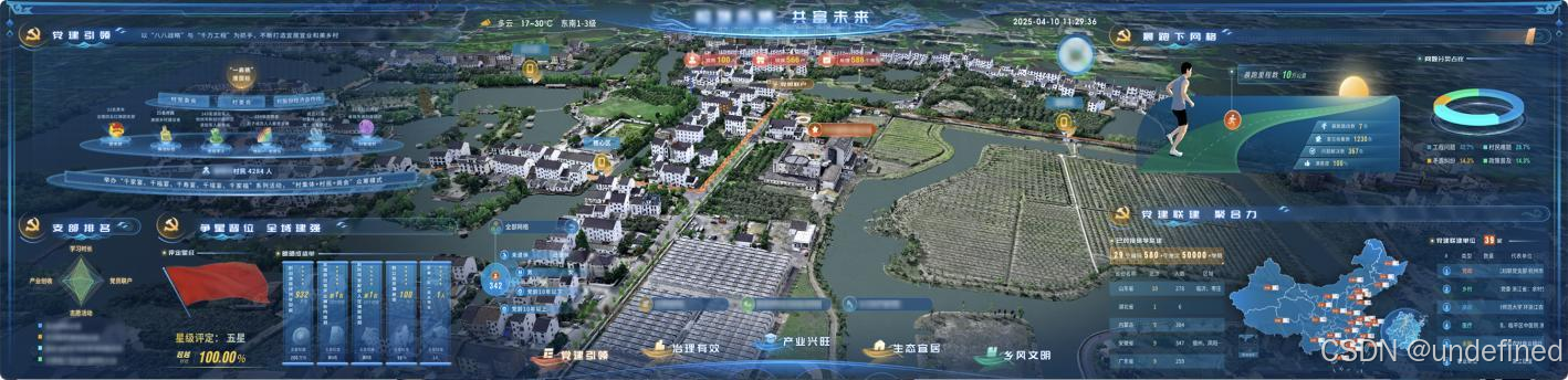 基于高精度的倾斜摄影模型构建三维立体地图,并采用轻量化的渲染技术,适配乡村 本地化的部署环境,通过 GIS 引擎将资产点位、党建网格等业务数据与空间坐标绑定。网 格员可以通过三维全景地图快速定位问题区域,有效缩短了任务的派发周期,显著地提升 了空间治理的效率。同时,文旅投资者也能够通过三维模型快速查看当地的项目环境,辅 助其决策效率优化,实现招商展示的"立体化"升级。
