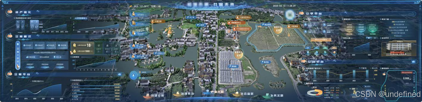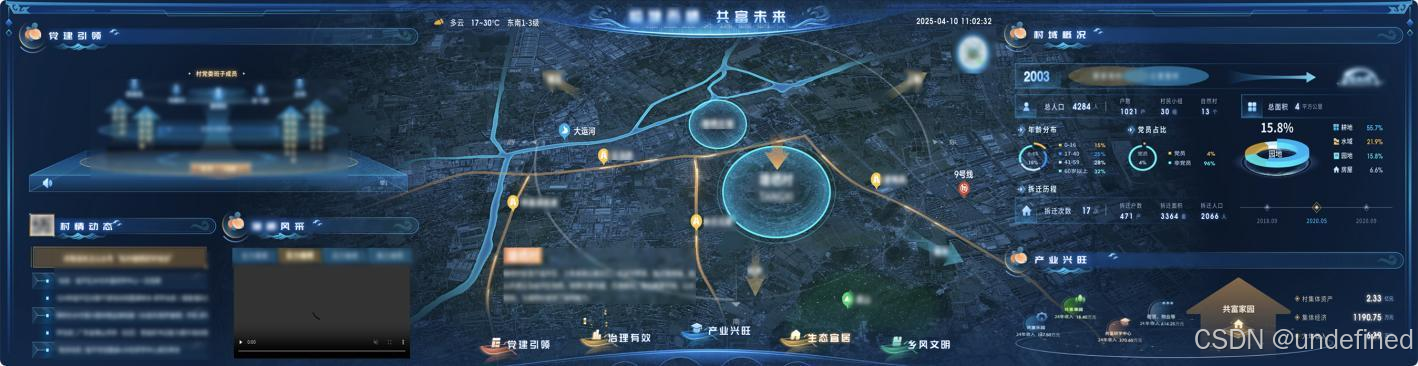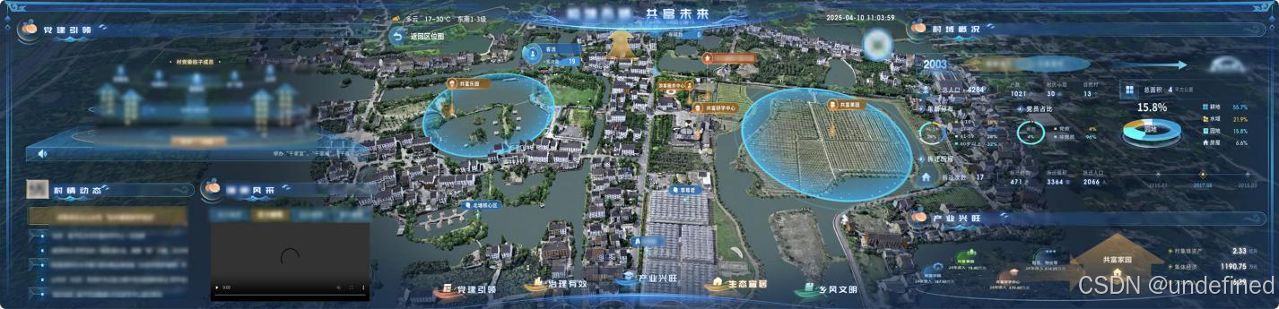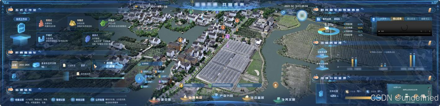 某地智慧乡村数字孪生驾驶舱结合当地的区域特色场景,聚焦于数字乡村治理、文旅 产业升级、基层党建创新三大领域,同时借助倾斜摄影技术,以当地的全景图作为主视觉, 立体化地突出展示了空间场景。集成乡村治理、产业发展、民生服务、基层党建、生态保 护等多个核心领域的数据信息,赋能该地区的差异化治理,实现跨体系的多维度数据实时 展示与协同分析。通过"空间数字化+数据可视化+业务联动化"的模式,助力某地利用数字化手段重构治理模式、激活产业动能,实现乡村治理、产业发展、民生服务等领域的数 字化转型,成功地打造了乡村振兴的数字化标杆。