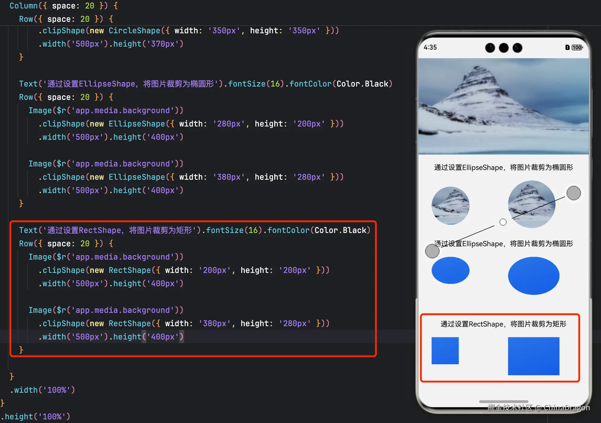Text('通过设置RectShape,将图片裁剪为矩形').fontSize(16).fontColor(Color.Black)