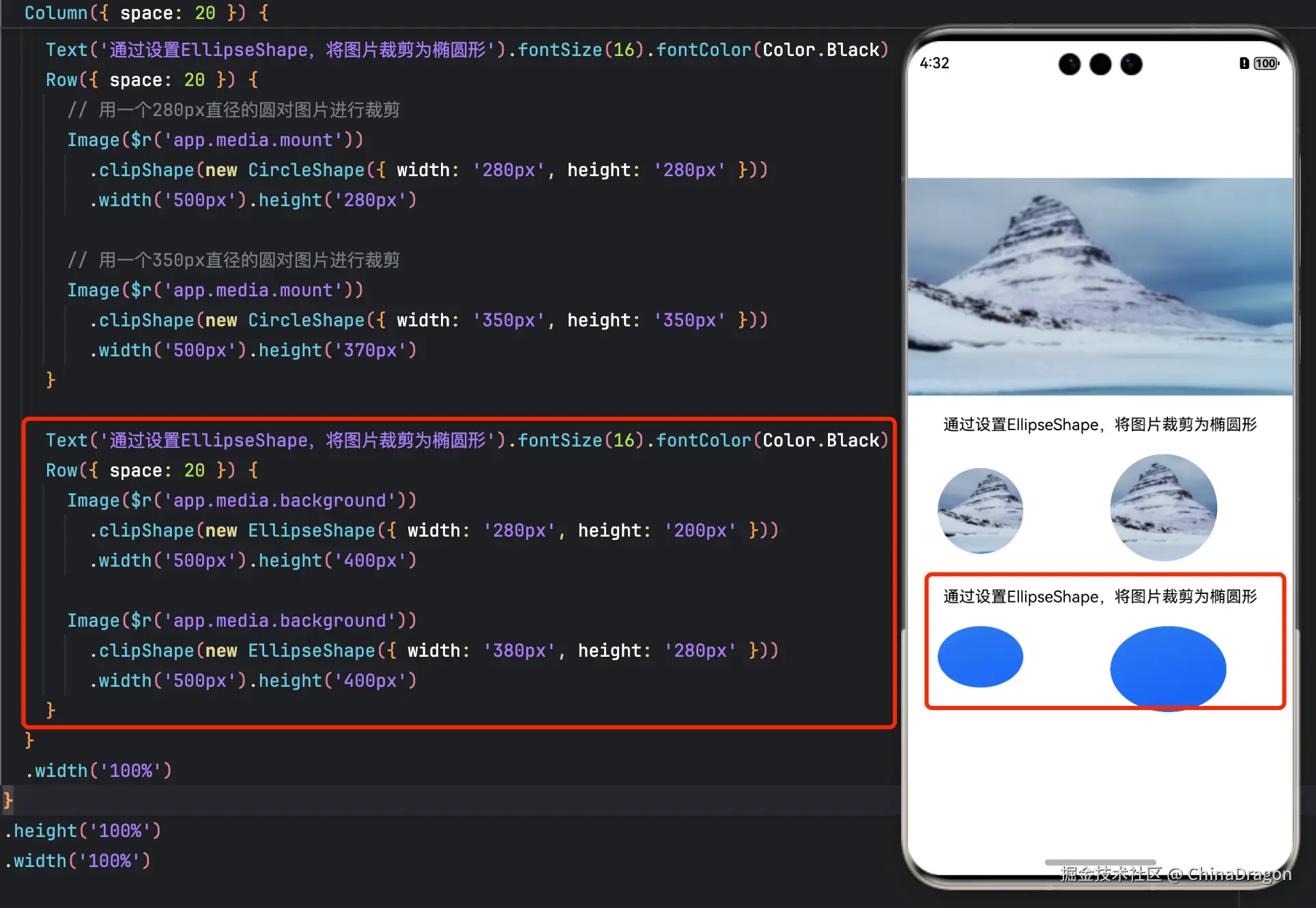 Text('通过设置EllipseShape,将图片裁剪为椭圆形').fontSize(16).fontColor(Color.Black)