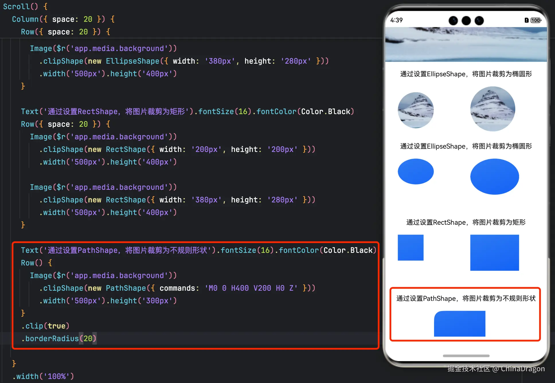 Text('通过设置PathShape,将图片裁剪为不规则形状').fontSize(16).fontColor(Color.Black)