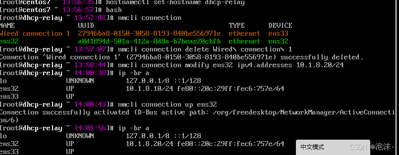[root@dhcp-relay ~ 14:02:33]# nmcli connection add type ethernet ifname ens33 con-name ens33 ipv4.method manual ipv4.addresses 10.1.1.20/24