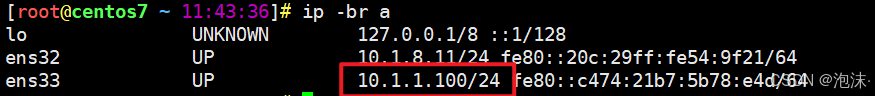 ens33 UP 10.1.1.100/24 fe80::c474:21b7:5b78:e4d/64