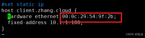 在配置文件中,host声明可以将MAC地址绑定到IP地址。 此配置对于始终为特定系统的网络接口提供相同的IP地址特别有用,尤其是Web或数据库系统之类的服务器。