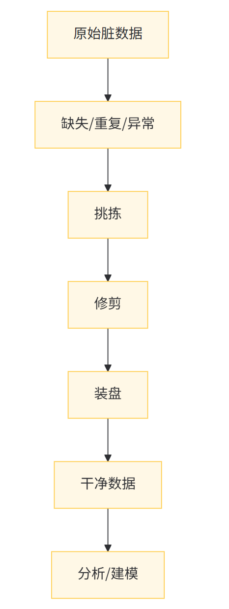 数据清洗 = 把坏的挑出去,把好的洗干净,再切成一样大小的块,方便下锅。