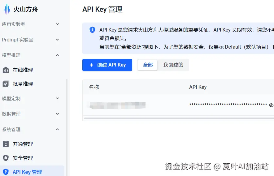 然后点击创建API Key即可,创建时注意把API Key复制下来。