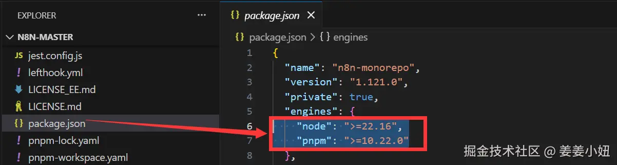 我们查看项目package.json文件可以看到,对于node和pnpm是需要固定版本及以上的,如下