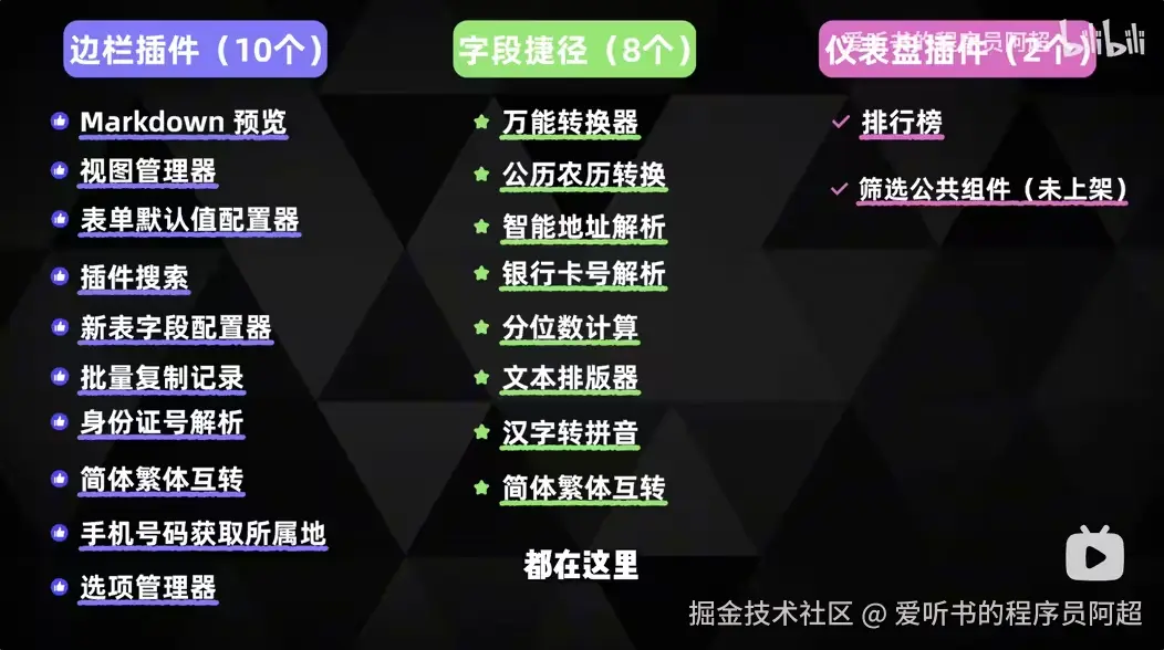 阿超作为每天都在用飞书多维表格的重度用户,并且给多维表格开发了 20 多个好用的插件,也收到了很多的插件用户好评~